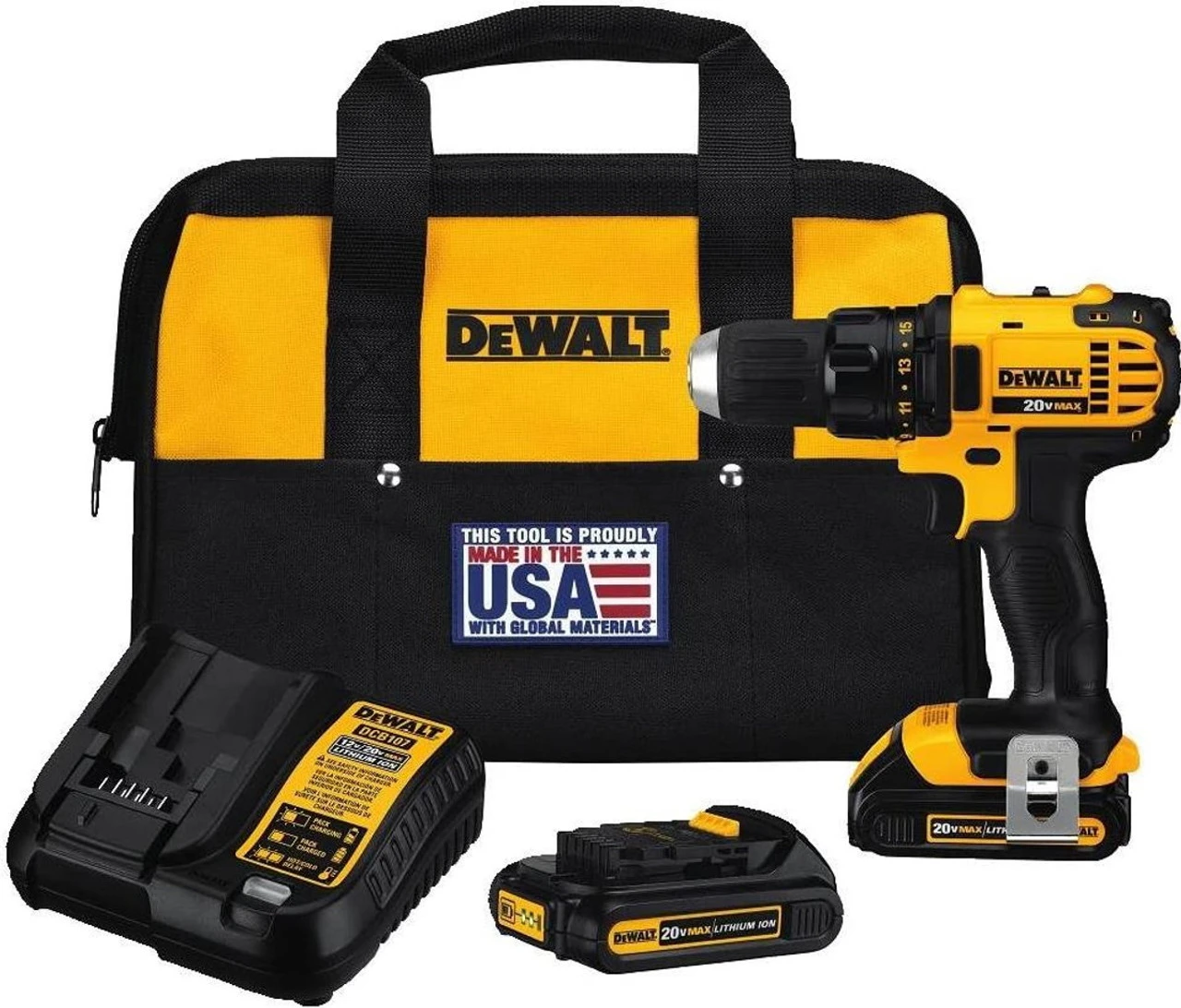 - Includes drill/driver, two 20-Volt lithium-ion batteries, 30 minute charger, belt hook, on-board bit holder and a contractor bag