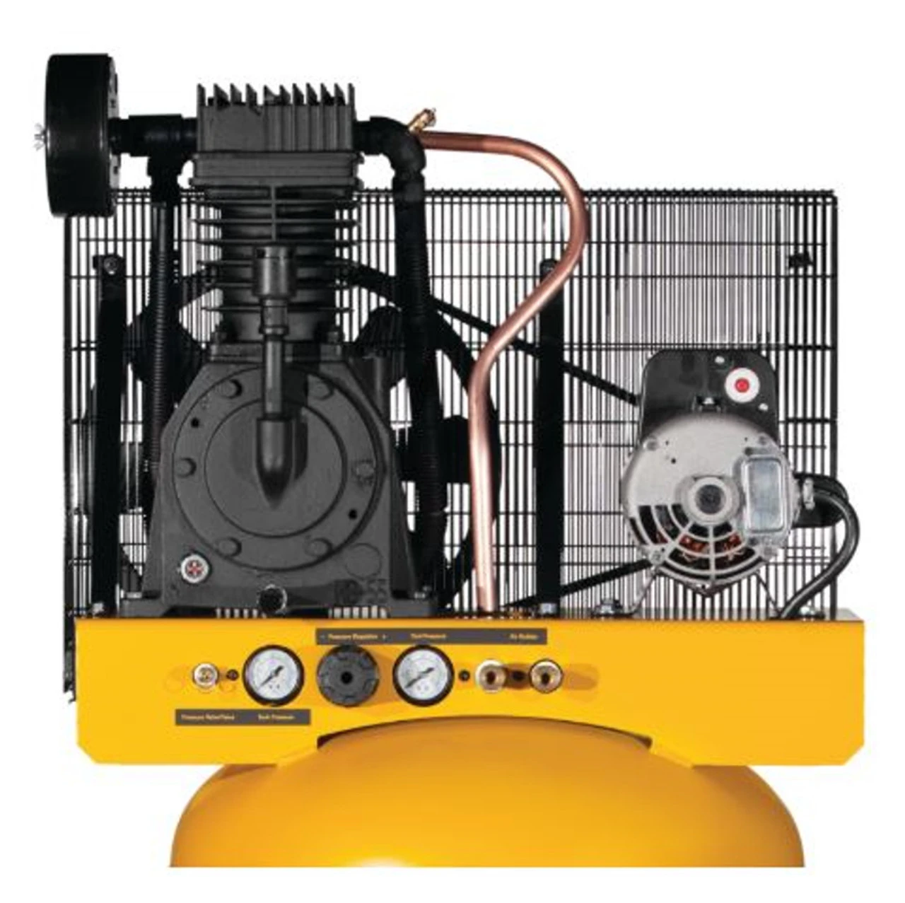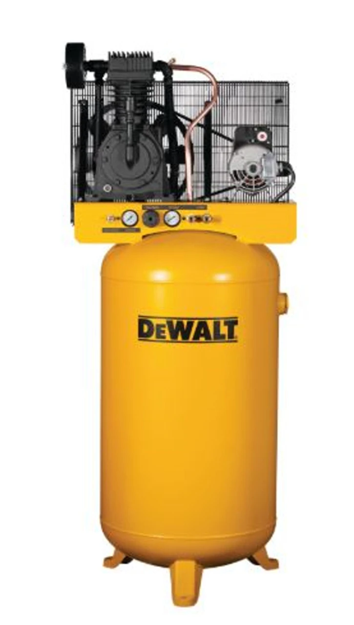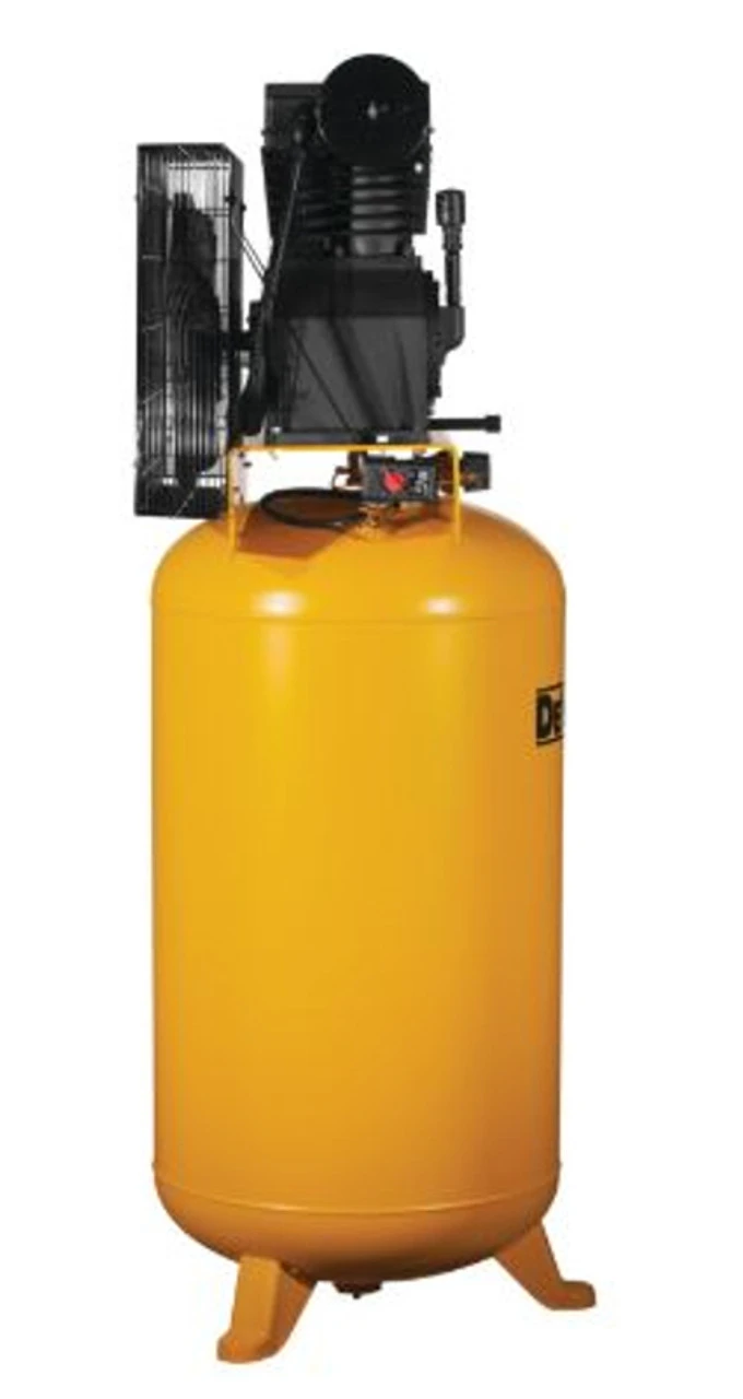 The DEWALT 80 Gallon Belt Drive Compressor features a cast iron, twin cylinder, two stage, oil lubricated pump, a heavy duty 240 volt induction motor, integrated control panel and is shipped with synthetic oil.