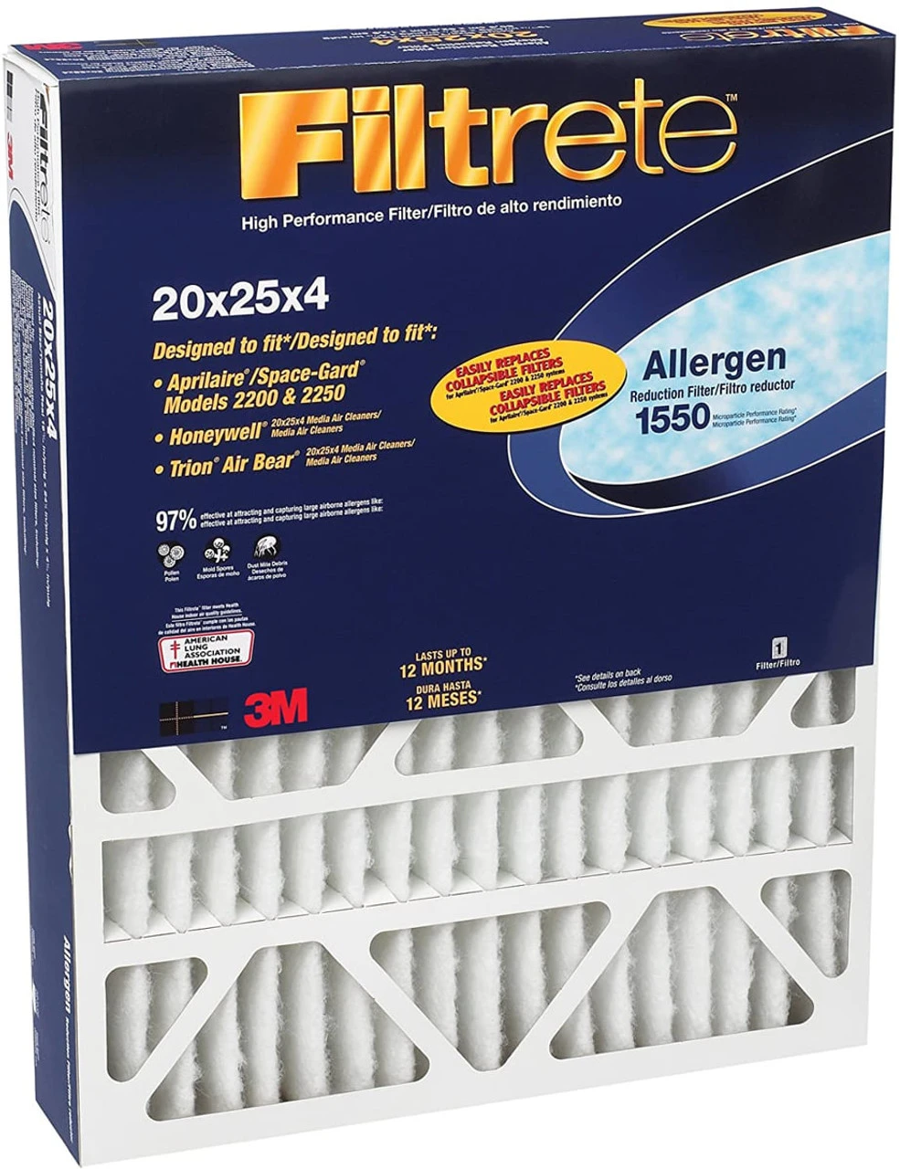 Built to fit air cleaners that use an air filter sized at 20x25x4, this 4-pack Filtrete Allergen Reduction model from 3M (#1550) reduces up to 97% of dust mite debris, mold spores and pollen from your indoor air for up to one full year. This filter will fit into air cleaner systems from brands including Aprilaire, Honeywell or Trion. A genuine OE product from the manufacturer, this is an ideal filter to stock-up on prior to the spring and fall allergy seasons. Order this 4-pack of 3M Filtrete Allergen Reduction Air Cleaner Filters today!