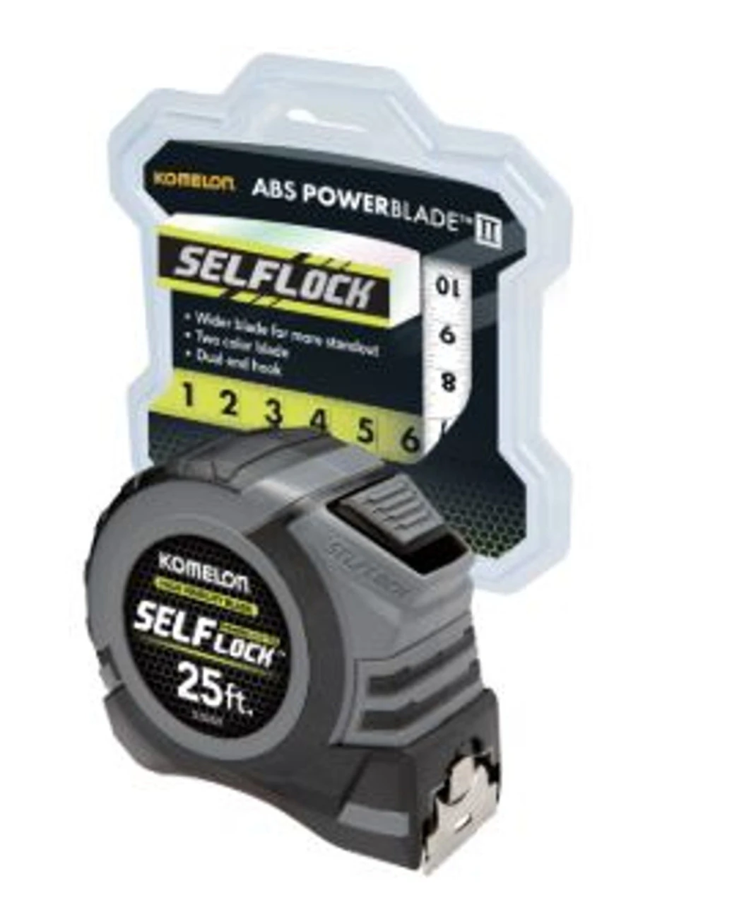 Komelon’s Self Lock Power Blade II is specifically designed to provide the wider blade and added standout desired by industry professionals. Our self lock feature allows you to extend the blade and leave it locked at extension, then to release the tape back into the case you simply use the thumb push button to return the blade into the case. In addition, this tape comes equipped with large read numbers and backside printing for easy measuring. This tape has a high visibility blade which sets it apart from the competition.