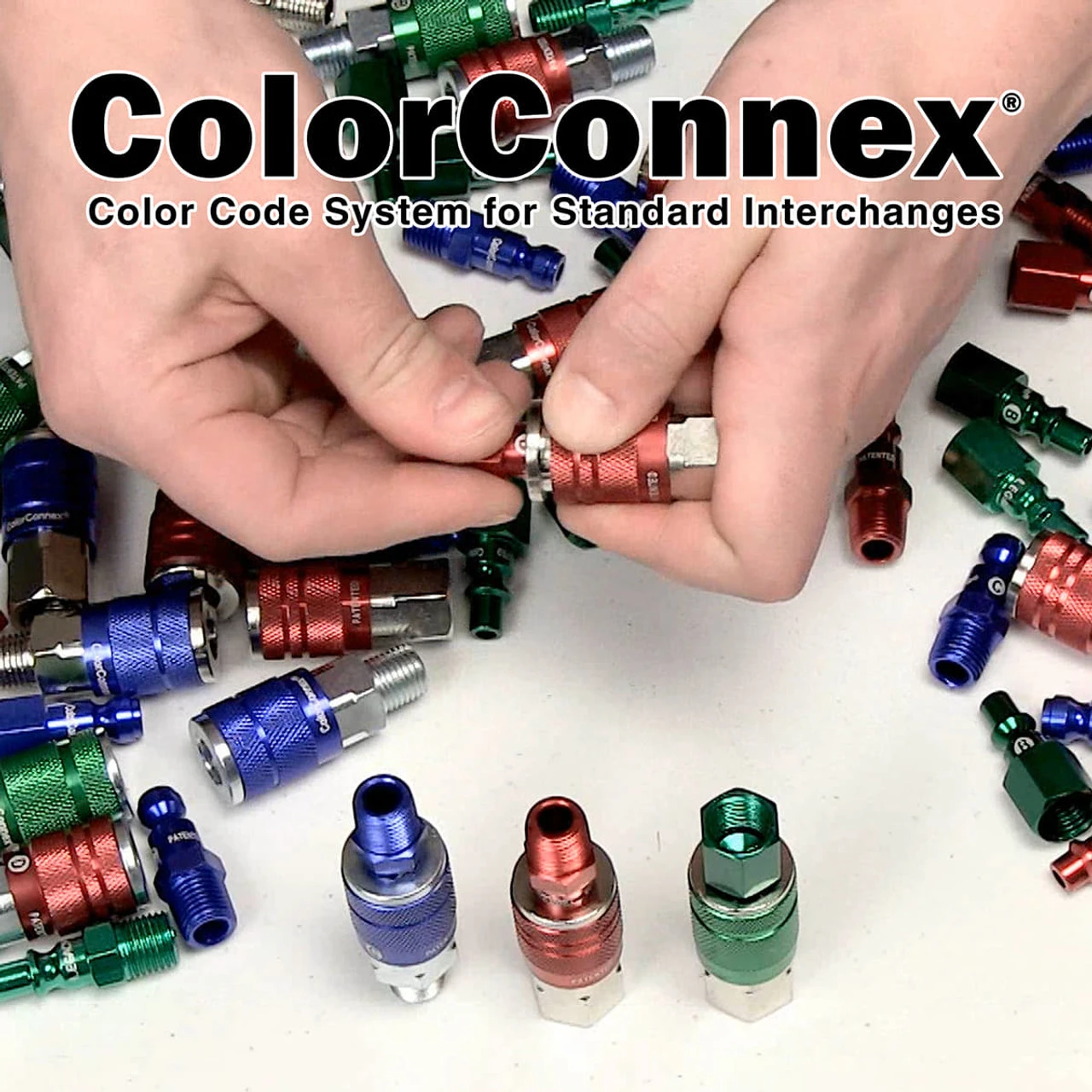 Dedicate your air lines with Legacy ColorConnex air couplers. These special color-coded couplers match up with same-color plugs for easy, no-problem pneumatic interchanges. They eliminate confusion and the possibility of crossing and contaminating different air lines. ColorConnex couplers have zinc plated steel coupler bodies with color-coded, hard-anodized 6061-T6 aircraft aluminum sleeves. All ColorConnex couplers are sleeve-style couplers that won’t come apart unless you disconnect them. Make sure that your connections are compatible–just connect the colors with ColorConnex air couplers from Legacy.