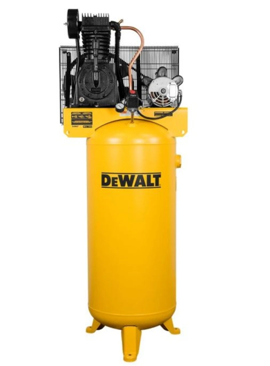 The DeWaltร 5 HP 60 Gal. two stage oil-lube industrial air compressor is designed for the heavy-duty professional user. This compressor features a heavy-duty 5 HP tops motor with Thermal Overload Protection System protecting the motor from voltage fluctuations. Along with the patented pump and piston design that provide a cooler running machine while maintaining consistent compression efficiency, it has 175 maximum psi to operate a wide range of tools while maintaining longer run times. It also features patented deep-grove directional and asymmetrical cooling fins and patented cast-iron flywheel design with large extended fins for improved cooling and low-pump RPM. Industrial performance delivers maximum CFM @ 175 PSI; provides enough power to operate more than one air tool or device at one time Low pump RPM for longer life Patented pump design provides for a cooler running pump Large capacity, 60 Gal. ASME air receiver Equipped with tank pressure gauge and on/off switch Wire form belt guard improves compressor cooling Four tie down holes in platform for ease in transporting Shipped with synthetic blend air compressor oil for optimum performance and long life