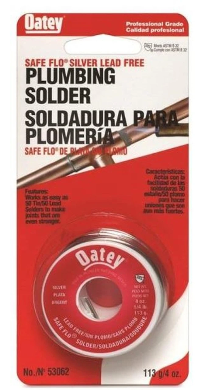 Alloy of tin, silver, copper and bismuth. Works with any high grade paste or liquid flux and a standard propane torch. Oatey No.95 tinning flux recommended. Provides excellent flow and fill characteristics with a melting range of 420 to 460 degrees F; 0.117″ diameter. Used for tin plate work, sheet metal seaming, and hot water heating lines. Meets requirements of Safe Drinking Water Act for use on copper potable water lines.