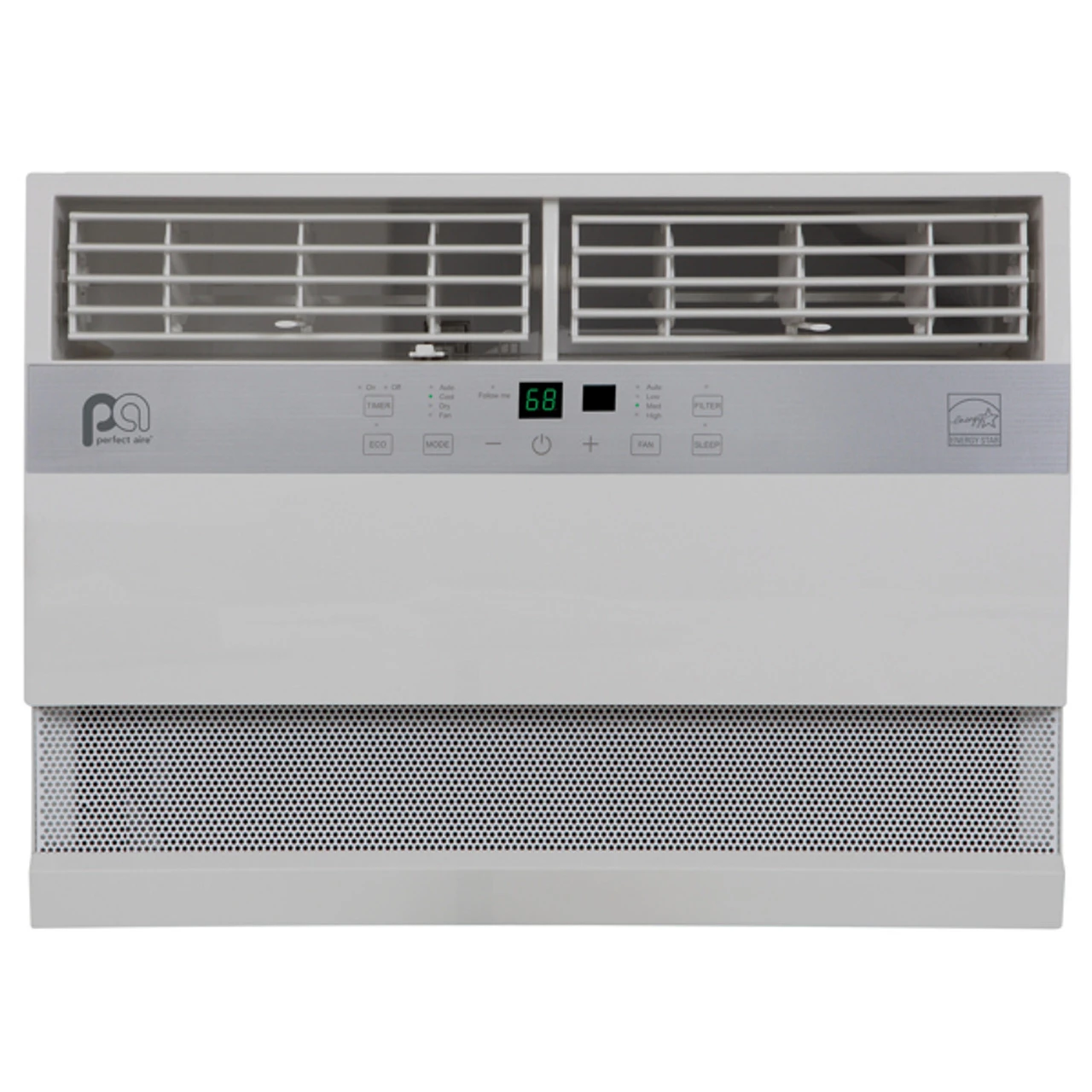 Nothing should get in the way of your comfort, which is why this flat panel window air conditioner is a sleek fit for your style and space. With a 10,000 BTU capacity, this Perfect Aire unit cools areas up to 450 square feetand it looks good doing it. An rating proves its just as efficient as it is discreet, designed with intelligent features that allow you to control the air around you. At the touch of a button, you can adjust your temperature settings, select from three fan speeds and direct exactly where you want the cool air to flow.