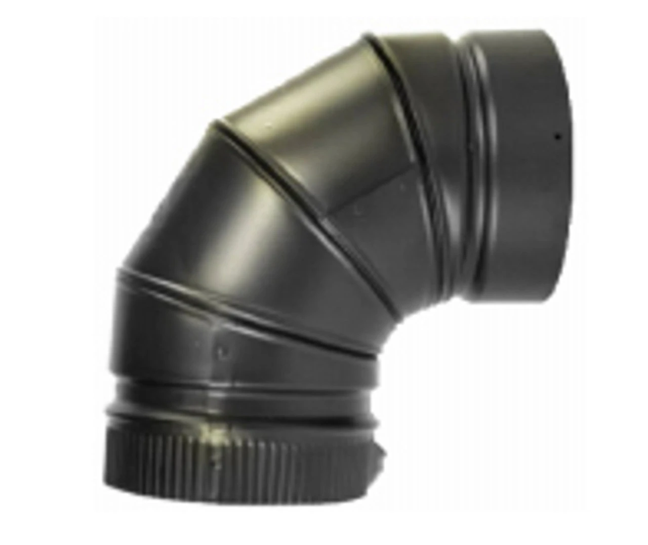 - DSP6E9-1, 6″, Black Matte Outer Finish, 90 Degree Elbow, Stainless Steel Inner Lining Smoke/Stove Pipe, Used to Offset Double Wall Stove Pipe Toward Insulated Chimney.